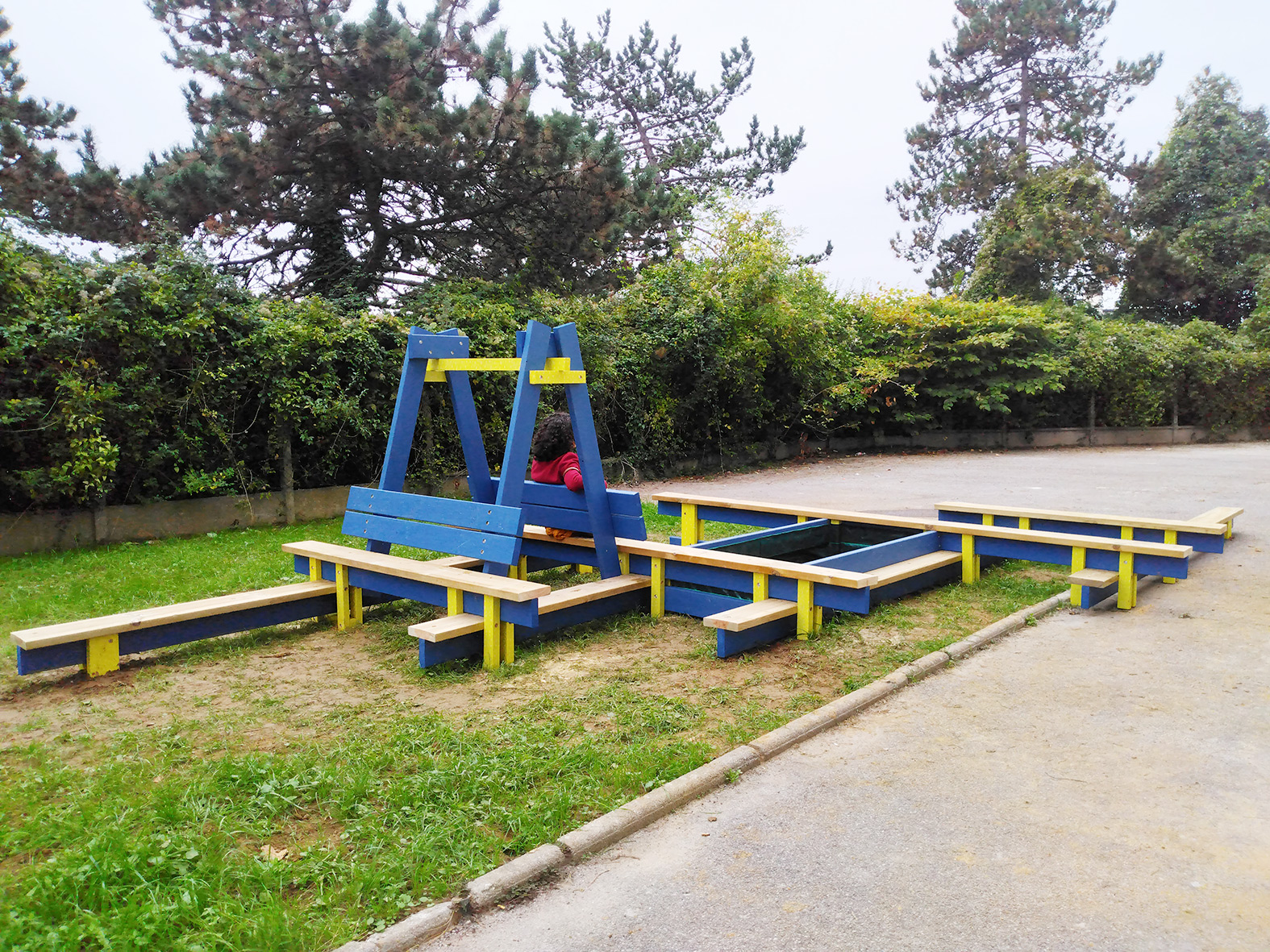 Deuxième projet : un dédale de poutres à parcourir à l’arrière du bâtiment E, avec une cabane pour inventer des histoires et un bac central qui verra s’épanouir des fleurs au printemps ;)